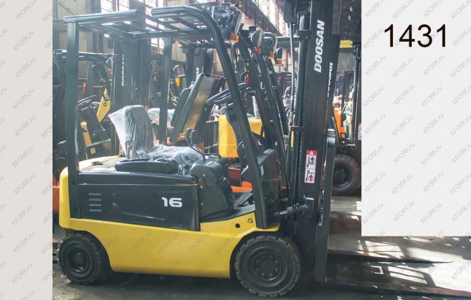 Электрический погрузчик Doosan Б/У с интентарным номером 1431 2007 года выпуска. Состояние - Хорошее. Имеет грузоподъемность 1600 кг. Гарантия: 4 мес или 500 м/час.